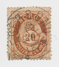 Land: Norge Katalog: NK27 Farge: Rødbrun til oransjebrun Utgitt: 1877 Kvalitet: Stemplet og har tidligere vært hengslet