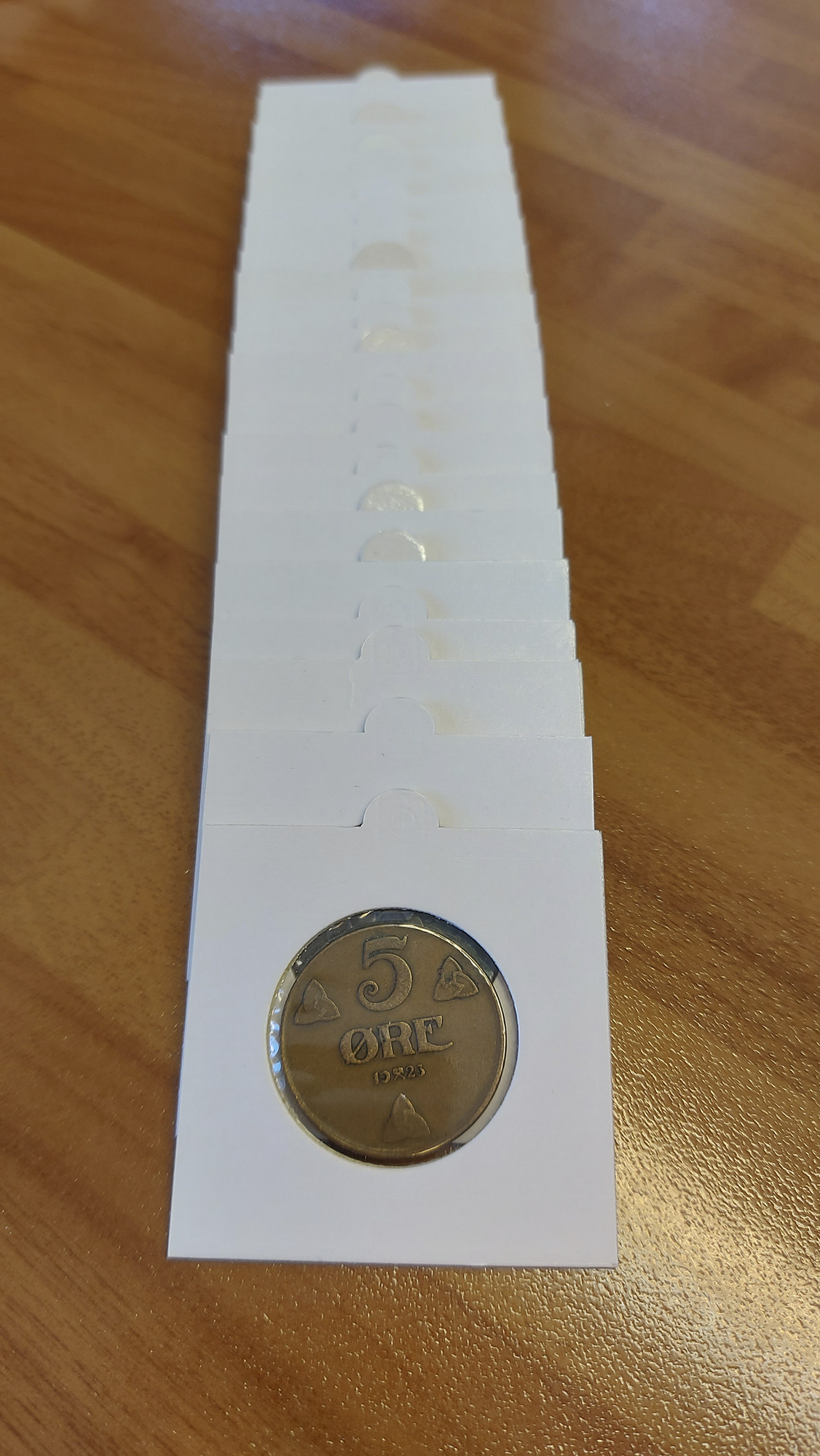 Norsk lot på 21 stk 5 øre fra år 1907 til 1951, er ikke komplett årgang. Myntene er i varierende kvaliteter og årstall. Leveres i myntrammer.