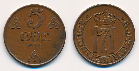 Valør: 5 øre - Årstall: 1914 - Kvalitet: s1+